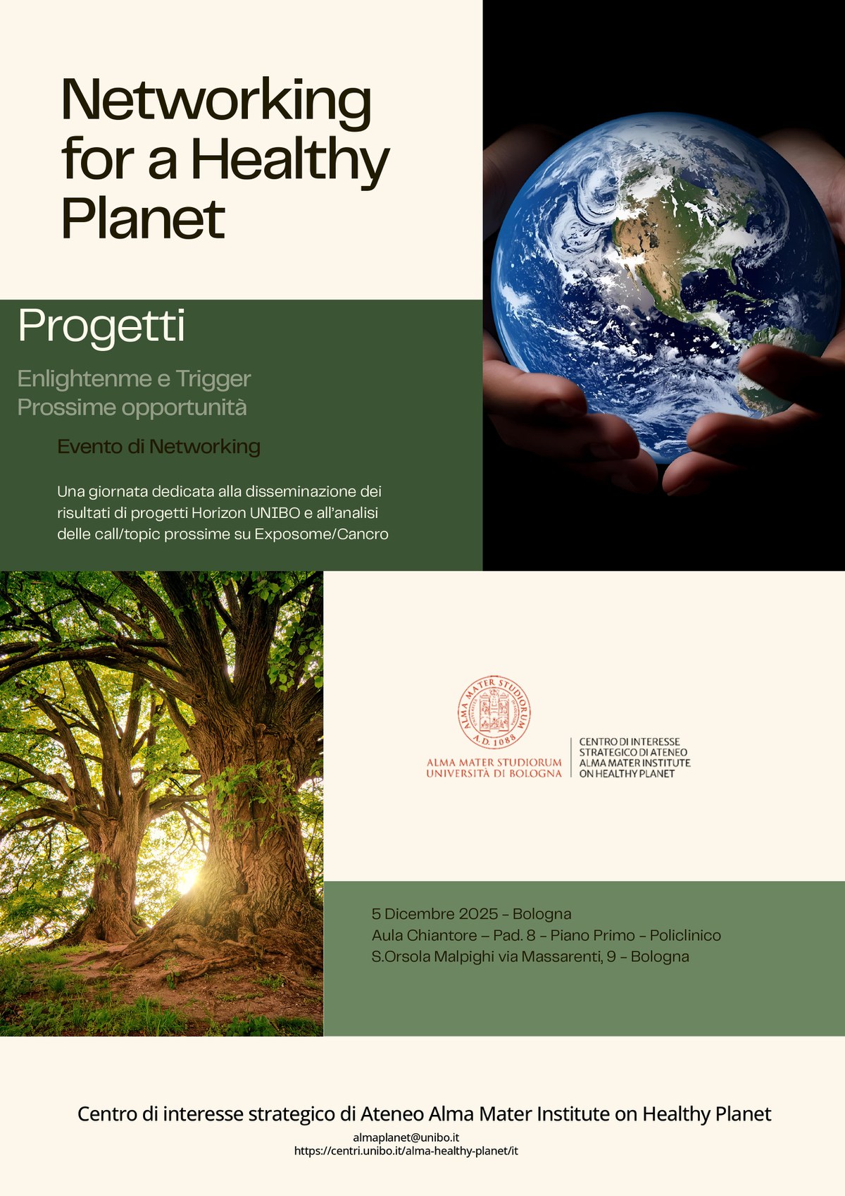 Il Centro di Interesse Strategico di Ateneo Alma Mater Institute on Healthy Planet (AHP) dell’Università di Bologna organizza una giornata dedicata alla disseminazione dei risultati dei progetti Horizon e all’analisi delle future call europee nei settori Exposome e Cancro, ambiti chiave delle missioni UE sulla salute.